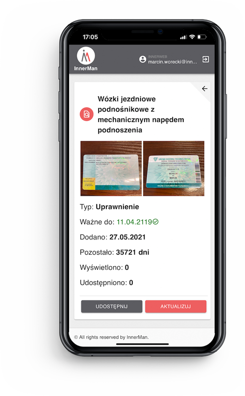 Zrób zdjęcie dokumentu, wprowadź jego ważność, zapisz i zapomnij. Powiadomimy Ciebie z wyprzedzeniem o upływających terminach ważności uprawnień. A jeśli udostępnisz wybrane dokumenty swojemu pracodawcy, to unikniesz zbędnej biurokracji w pracy